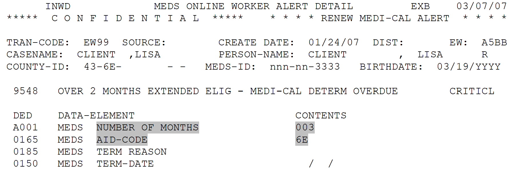 This alert is generated when a client previously Medi-Cal eligible in a category not administered by counties (e.g., former SSI/SSP) has been in an Extended Eligible (EE) status pending county completion of an SB87 Medi-Cal redetermination process for MORE THAN 2 months.