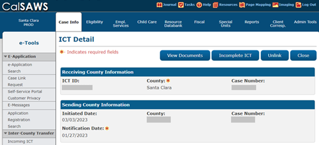 ICT Detail page appears to indicate the ICT ID is linked to the case. You can now process the ICT application according to current program policy.