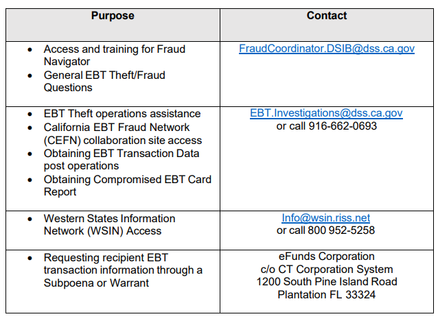 County SIUs and law enforcement agencies may need assistance obtaining EBT transaction data to support investigations and criminal prosecutions of those responsible for EBT theft. To request additional data, only the SIU or law enforcement staff can contact the CDSS EBT Fraud and Theft Detection Unit via email at EBT.Investigations@dss.ca.gov or call 916-662-0693 to obtain the information.